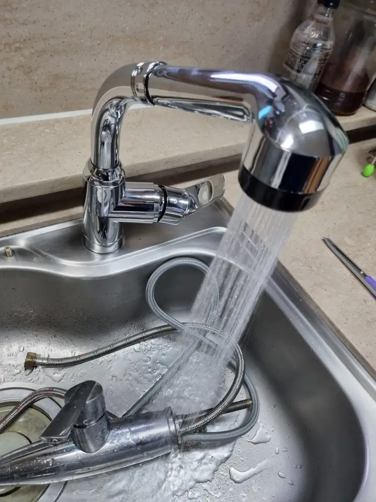 급수 밸브를 다시 열고 수전 레버를 천천히 올려 물이 부드럽게 나오는지 확인했습니다. 새 수전은 에어레이션 기능이 있어서 물줄기가 입체적으로 퍼지고, 물방울 튀김이 적어 고객님이 바로 만족하셨습니다. 샤워 헤드를 당겨 싱크대 주변을 세척하는 기능도 확인했는데, 호스가 길고 부드러워 청소가 훨씬 편해졌다고 하셨어요. 특히 누수 여부 확인을 위해 주방 하부 연결부와 수전 본체 주위를 휴지로 눌러 보면서 5분 정도 체크했는데, 전혀 물기가 묻어나지 않아 교체 작업이 완벽하게 마무리됐습니다. 마지막으로 수전 주변에 새 실리콘 라인을 깔끔하게 재도포하고 표면을 정리했습니다.
